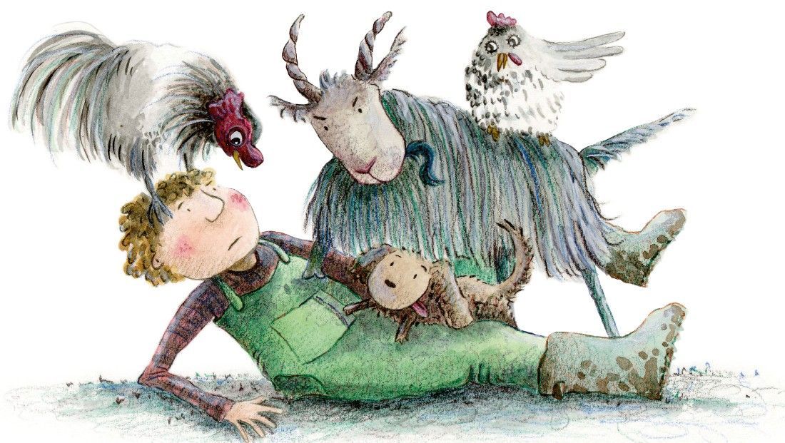 All at once, they try to tell him about the buzzard, Dribble, Campanula the Cat, claws, jealousy, storming off… Farmer Frederic can’t make heads or tails of it.